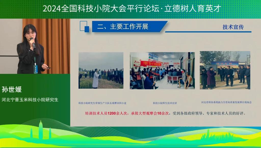 我校科技小院研究生孙世媛在“立德树人育英才”论坛分享了小院创新构建的全程式托管服务、“四位一体”新型农业经营两种新模式。我校科技小院建设成果及相关经验得到与会领导、专家一致肯定。
